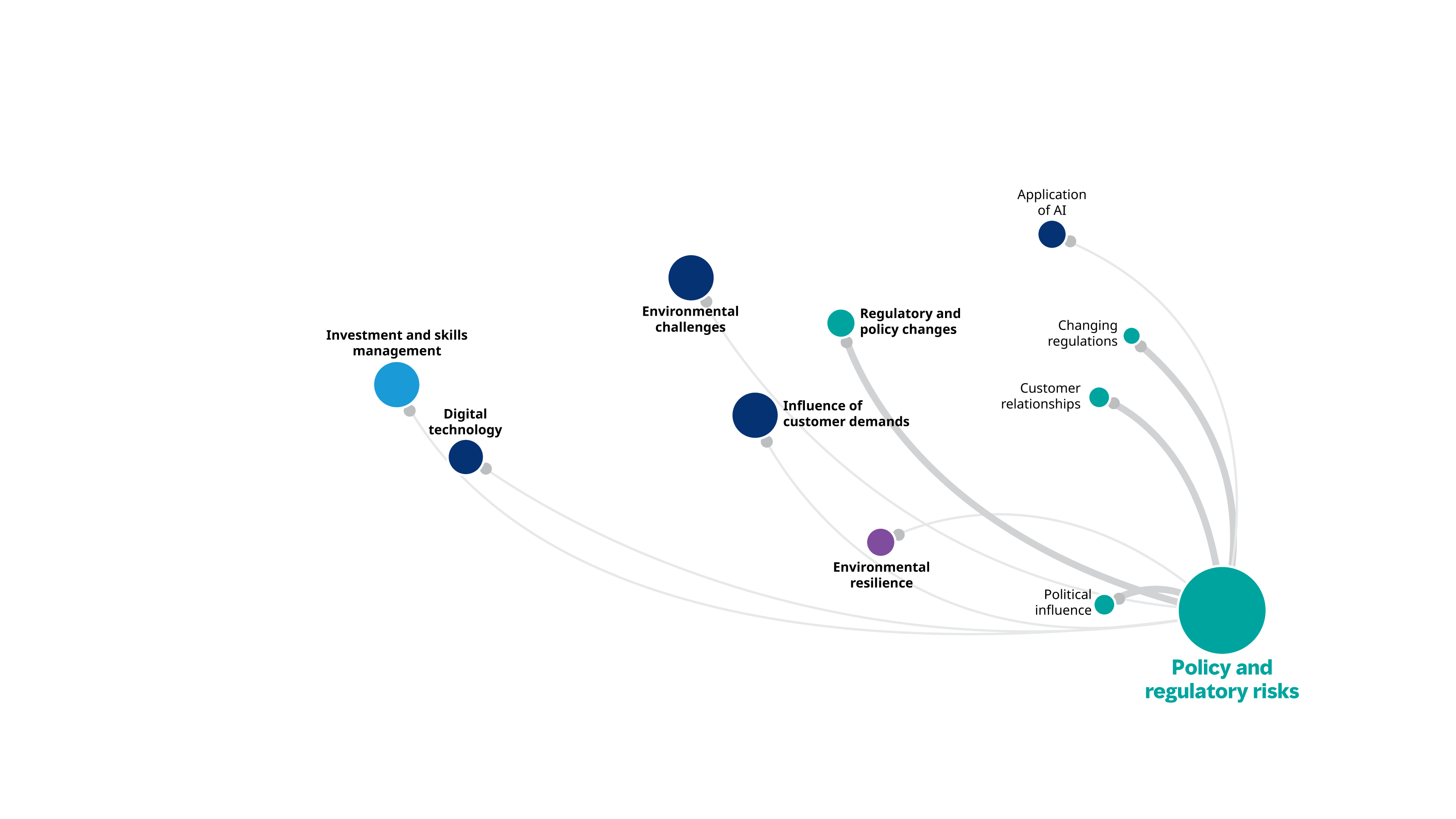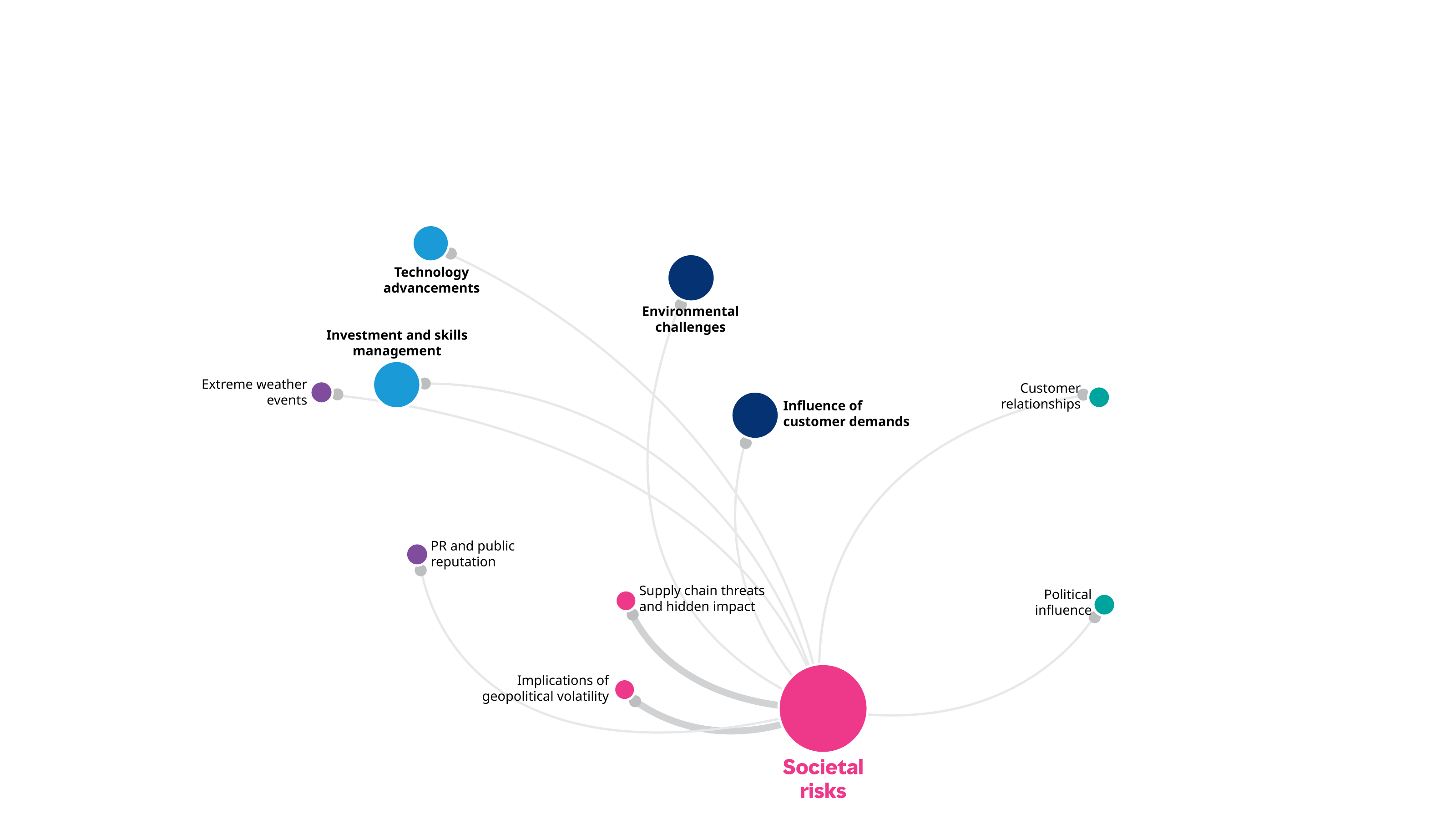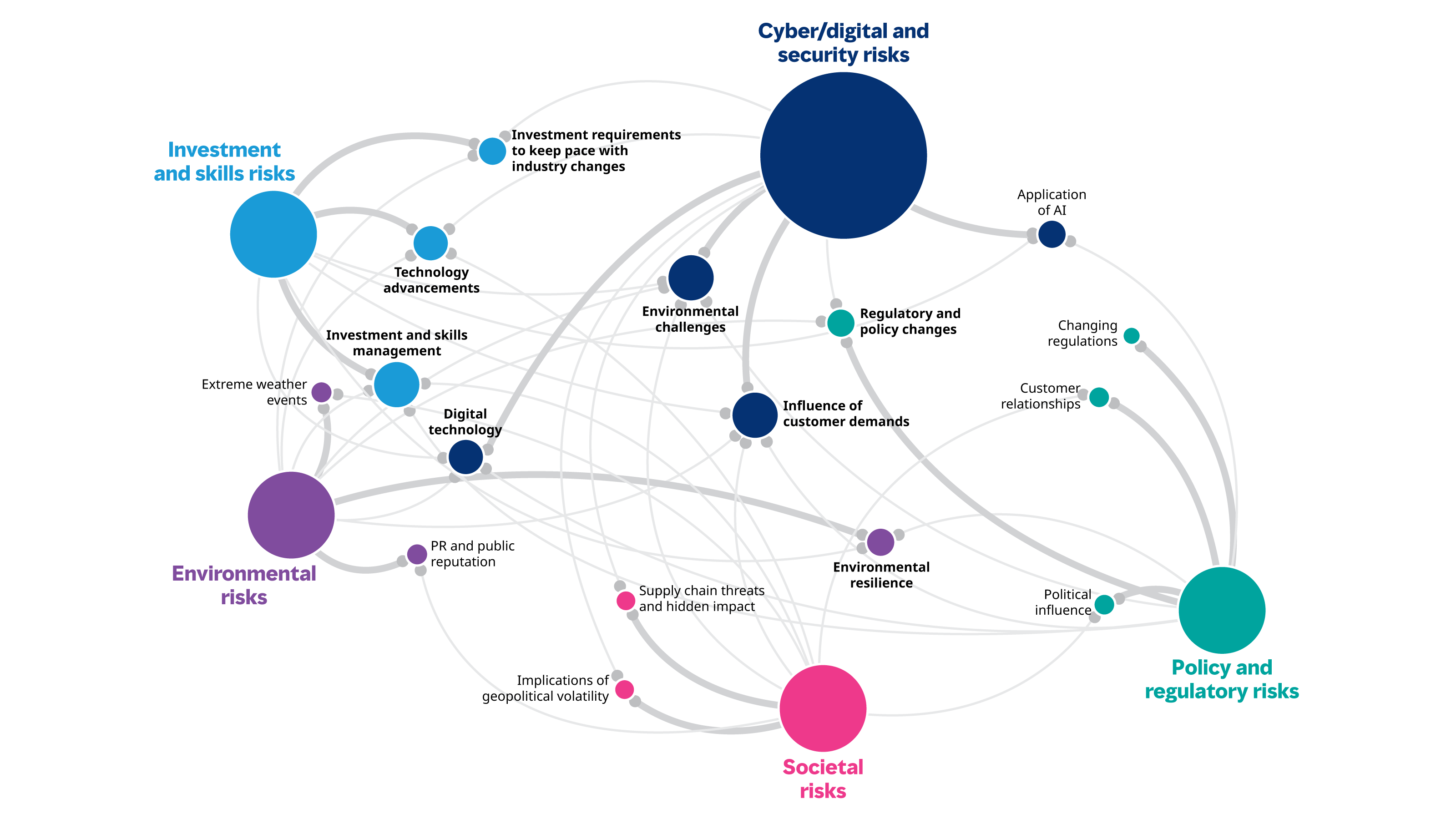 The Size of the nodes representsthe level of connectedness to each risk. The bigger the node, the more connected they are to other factors