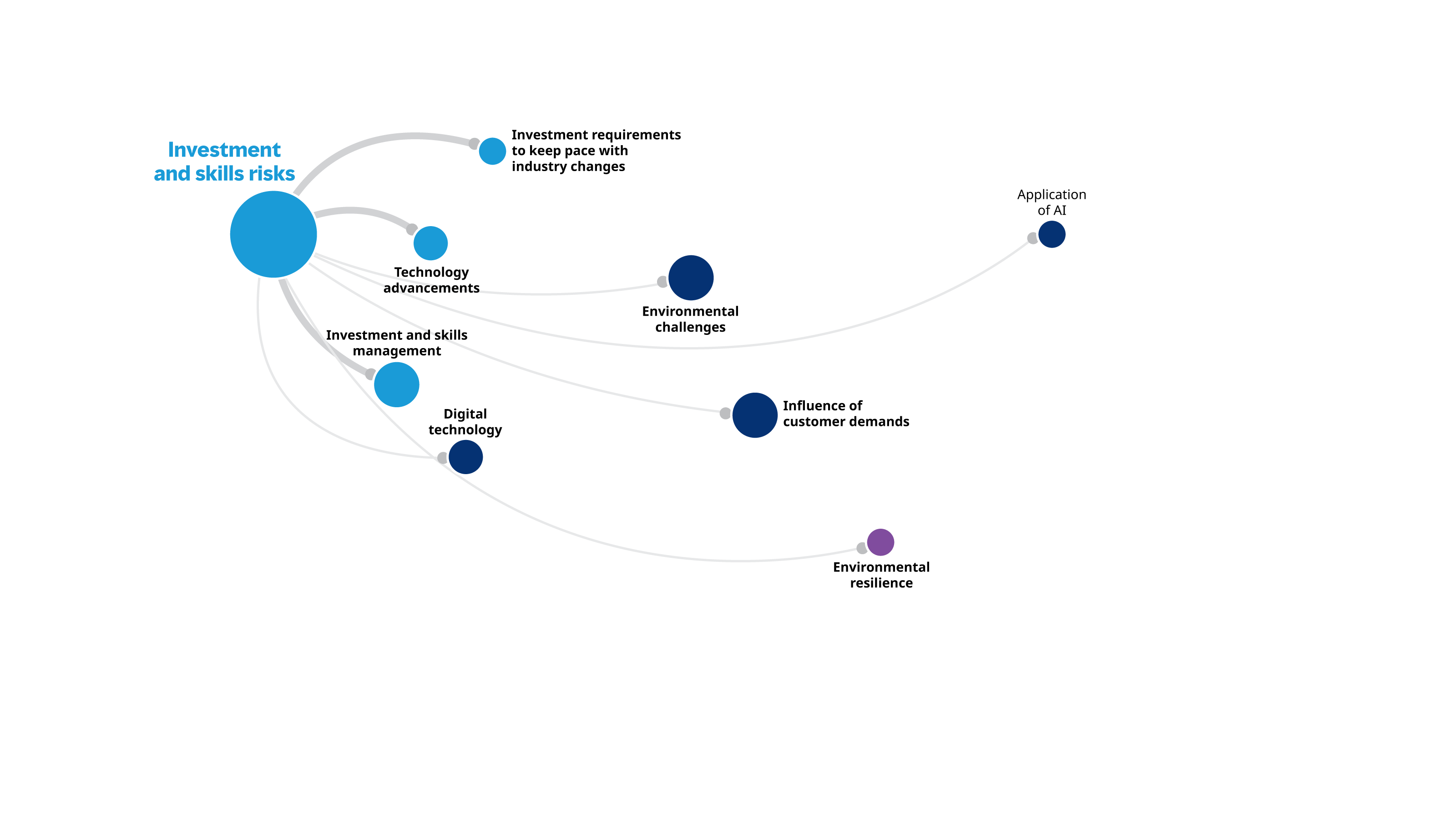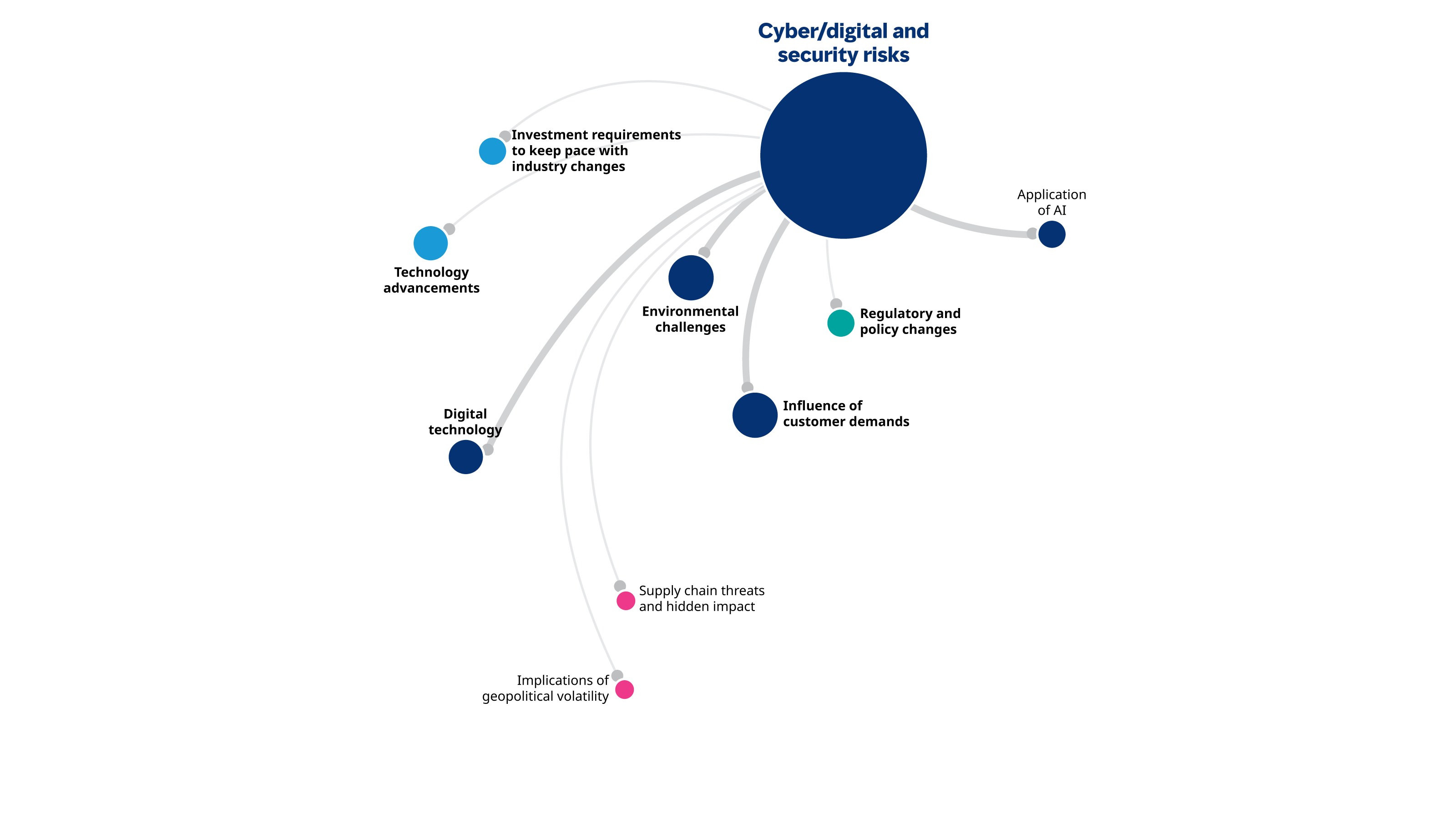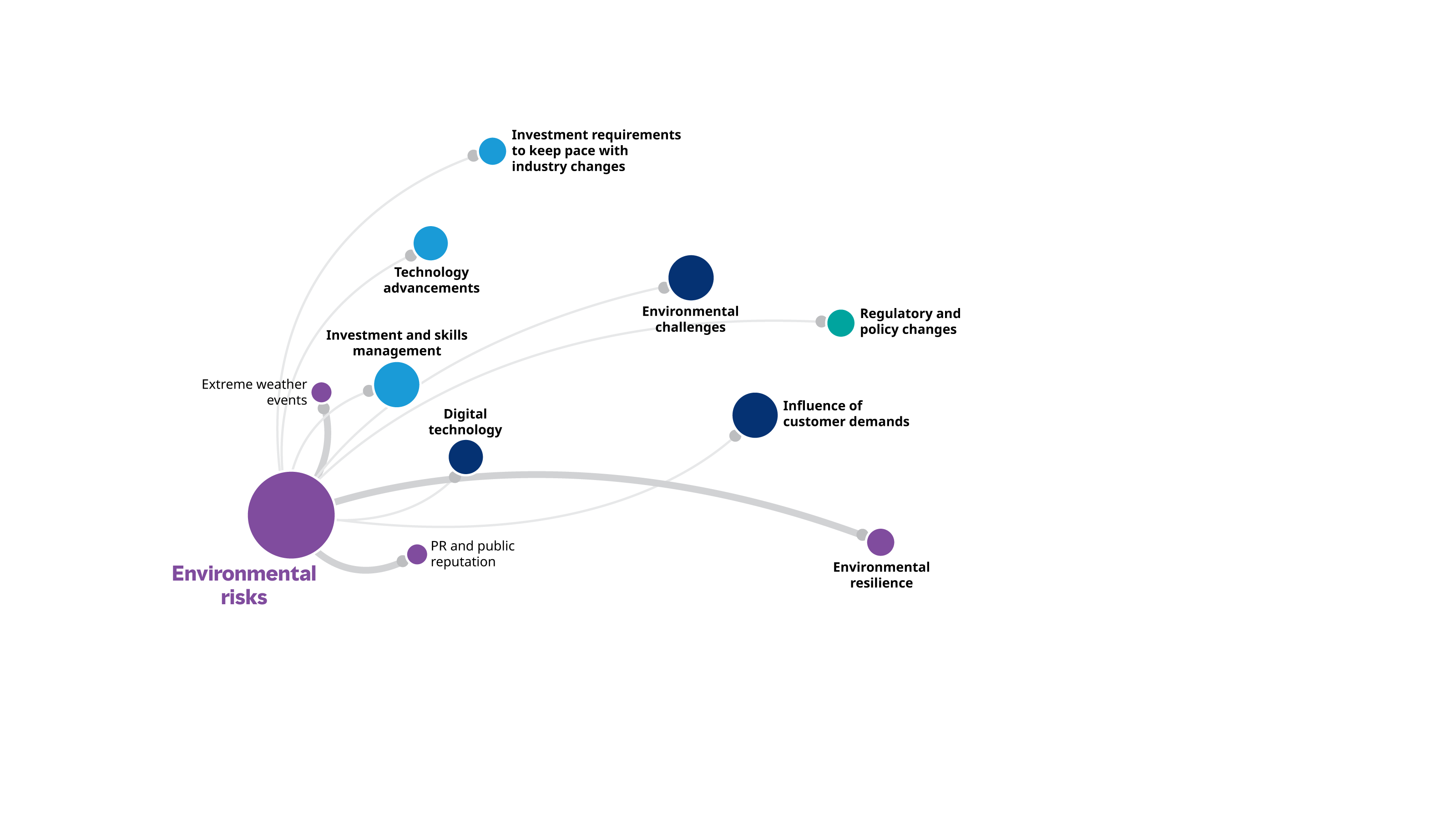The Size of the nodes representsthe level of connectedness to each risk. The bigger the node, the more connected they are to other factors